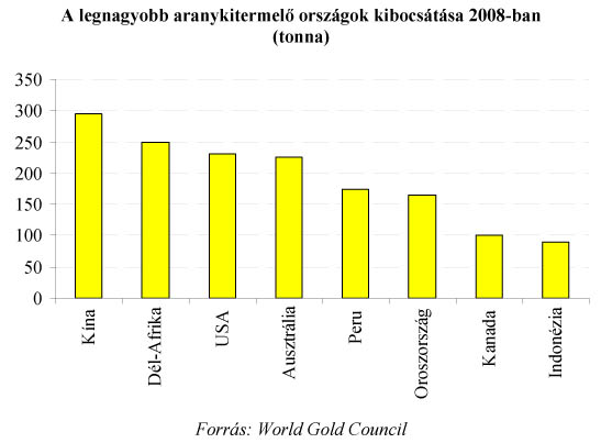 Felvásárlások és fúziók az aranyiparban - Forrás: Erste Group Research, Metal Economics Group Kínában 2001 óta a kibocsátás több mint 59 százalékkal emelkedett, így 2008-ra elérte a 260 tonnát. Kína az egyetlen olyan nagy kitermelő, aki növelte a kibocsátását az elmúlt időszakban. Csaknem 15000 kisméretű bánya működik a világ legnépesebb államában. Nyereségességük alapja az extrém alacsony személyi ráfordítás, illetve a bizonytalan környezetvédelmi szabályozás. ![]()