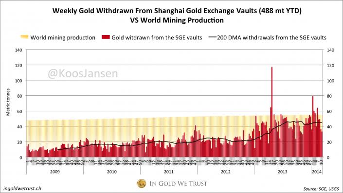 Conclude Daily Gold Egyre több olyan hét van, hogy a shanghaji aranytőzsdén leszállított áru mennyisége meghaladja a világ időarányos összes kitermelését. Az idén eddig 488 tonna fizikai aranyat hívtak le a sanghaji aranytőzsde trezorjaiból, 29 százalékkal többet, mint az előző év azonos időszakában. Ez napi bontásban 6,7 tonnát jelent, az előző évi 6-tal szemben. Ha ez az ütem megmaradna, akkor Kínának 2014-ben durván 1700 tonnányi sárga nemesfémet kellene importálnia, hogy kielégítse a Shanghai Gold Exchange igényét. A világ legnépesebb állama ugyanis tavaly 428,1 tonna aranyat termelt, miközben a tőzsdén 2180 tonna talált gazdára. Szakértők szerint a sanghaji tőzsde forgalma egy az egyben leképezi Kína aranykeresletét. A világ teljes aranytermelése 2013-ban 3000 tonna körül alakult, mely egy hétre leosztva 58 tonnának felel meg.